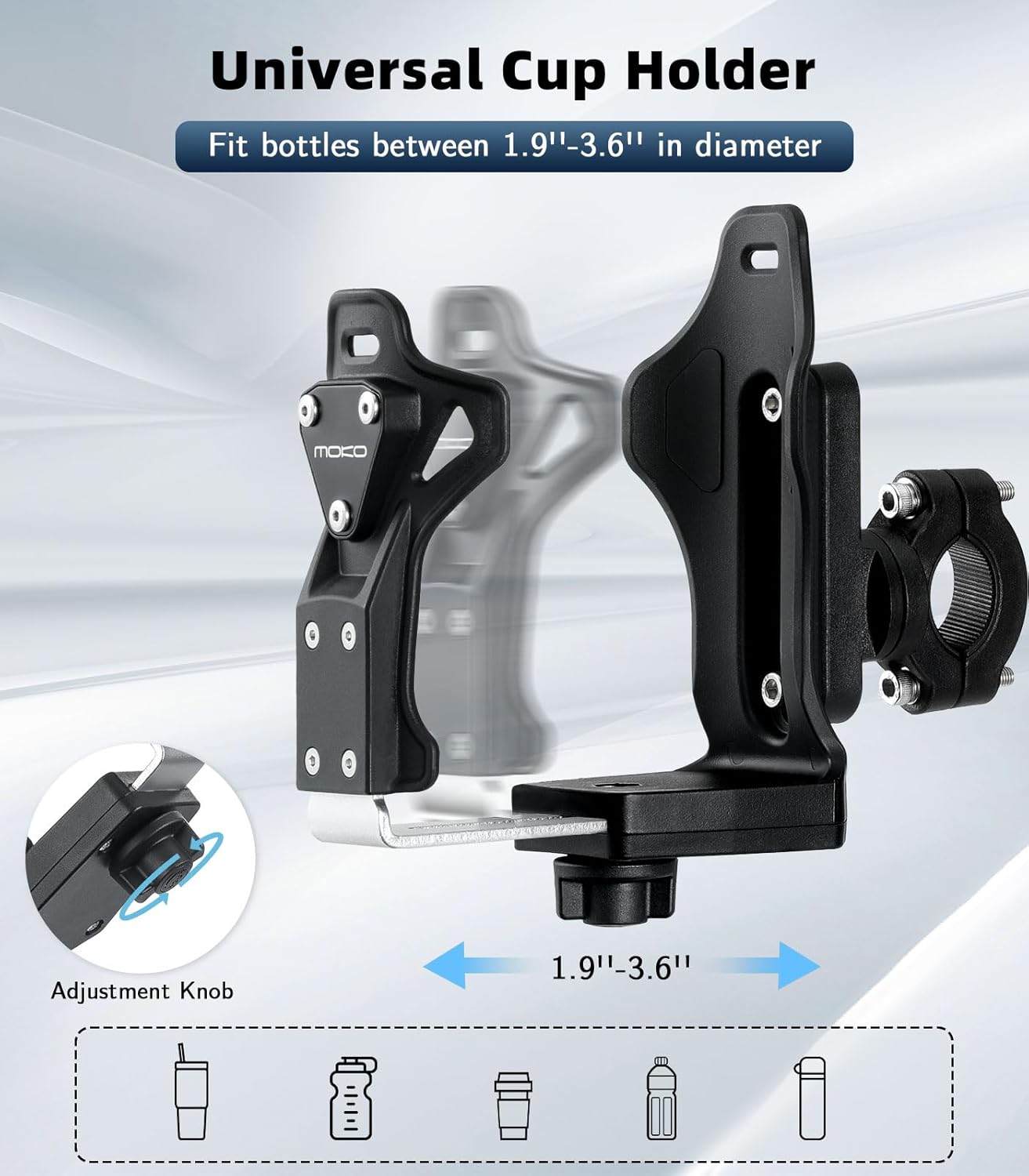 - Fits Most 1.9”-3.6” Water Bottles: The diameter of our bike water bottle holder can be adjusted between 1.9” -3.6”. Due to the adjustable design, the adjustment knob at the bottom of the water bottle holder for bike can quickly adjust the front and rear width. It can flexibly accommodate water bottles of different sizes, such as coffee cups, baby bottles, beverage bottles, sports bottles, thermos cups, etc.